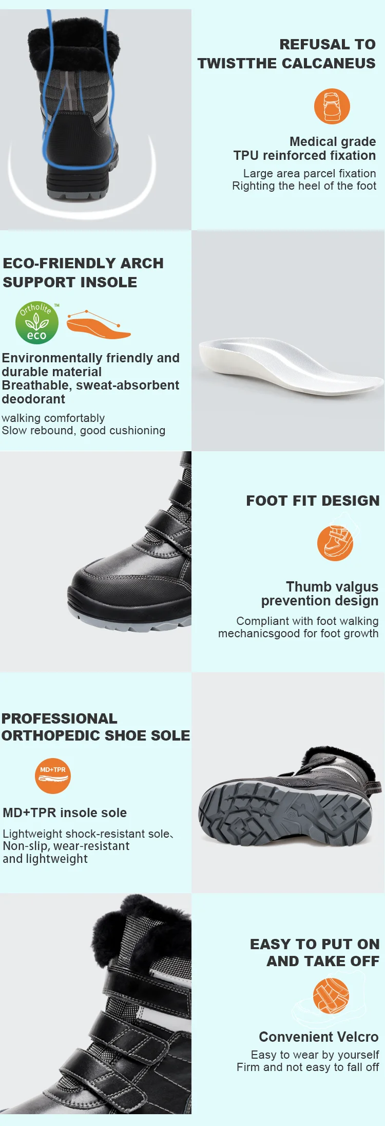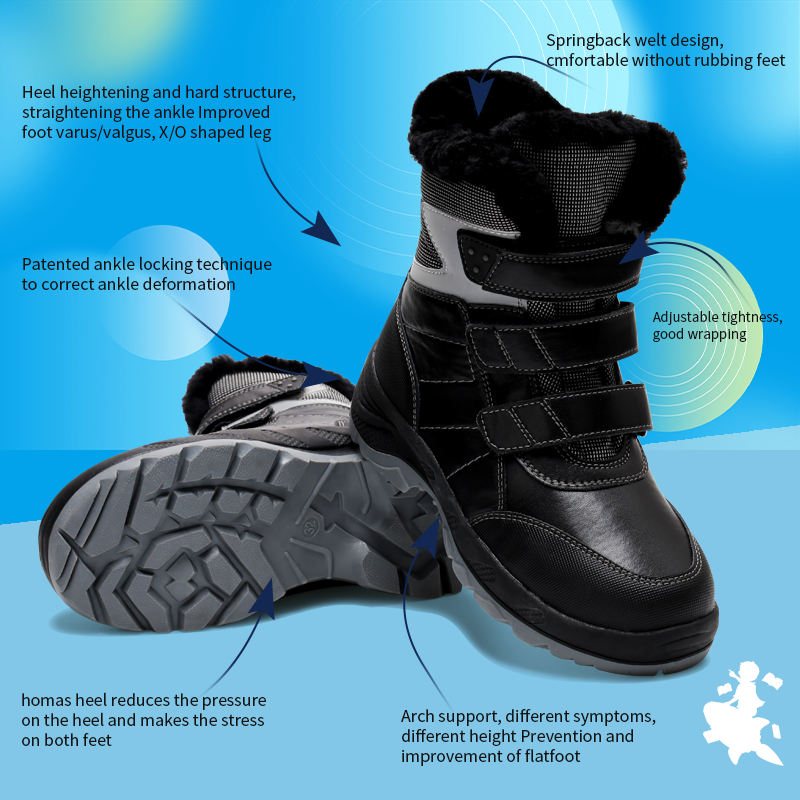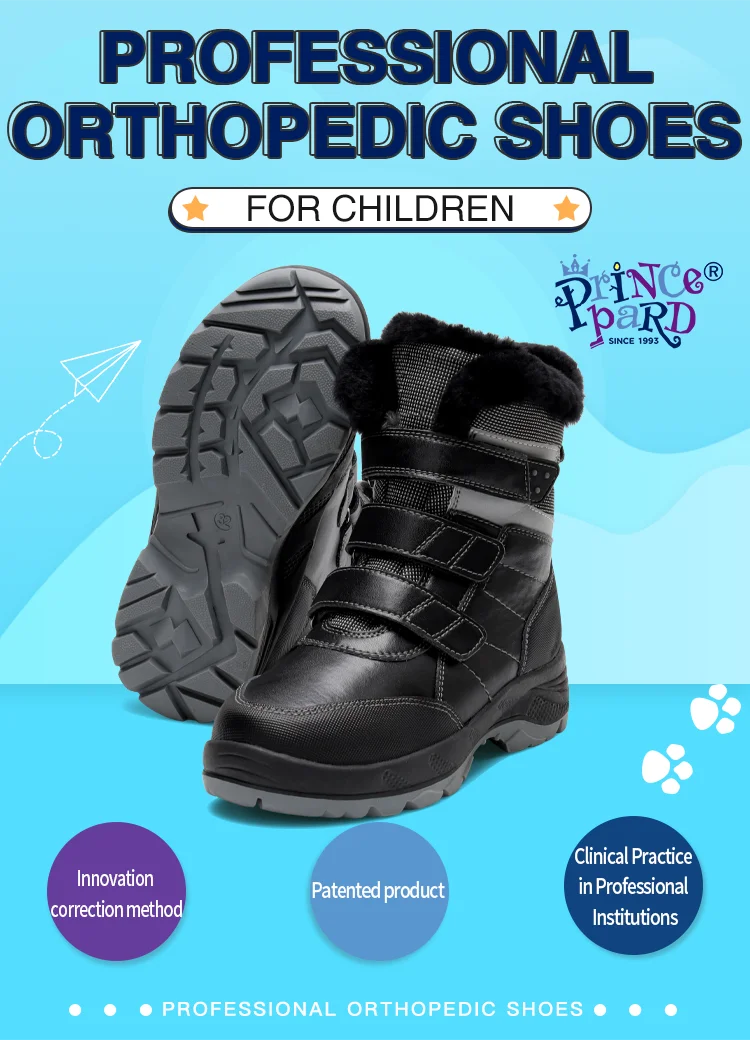 The orthopedic shoes, designed from the human biomechanical force principle, can scientifically correct irregular force of children's foot, and limit abnormal activity of foot joint, to help the healthy growth of the foot bones.