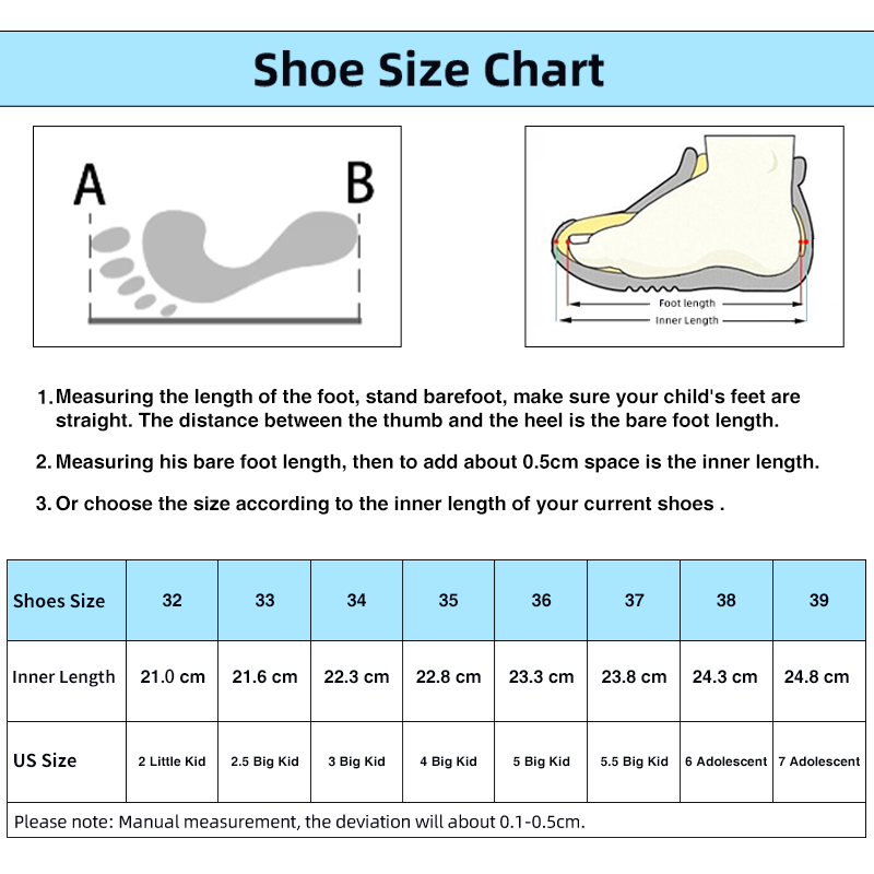 1.Measuring the length of the foot, stand barefoot, make sure your child's feet are straight. The distance between the thumb and the heel is the bare foot length. And then add 0.5cm to1cm space to choose the size.