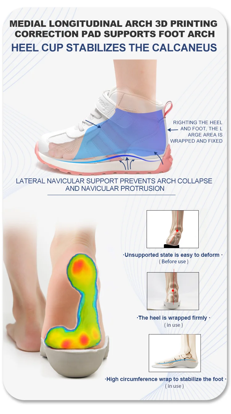 The orthopedic shoes, designed from the human biomechanical force principle, can scientifically correct irregular force of children's foot, and limit abnormal activity of foot joint, to help the healthy growth of the foot bones.