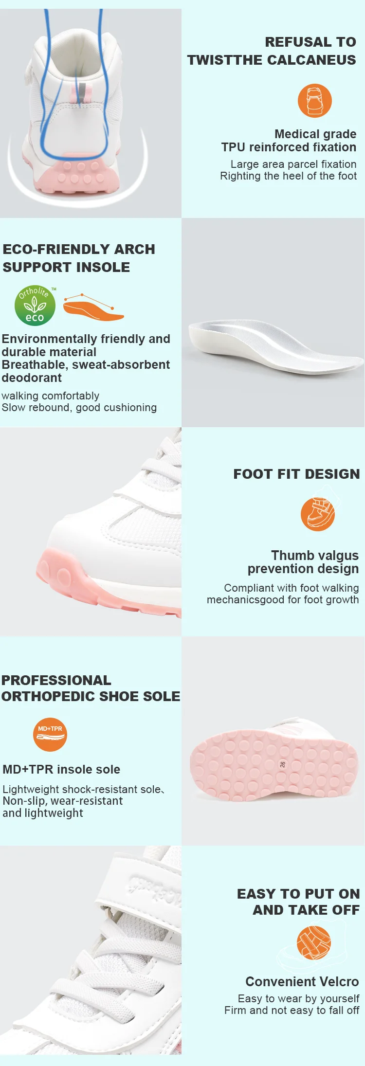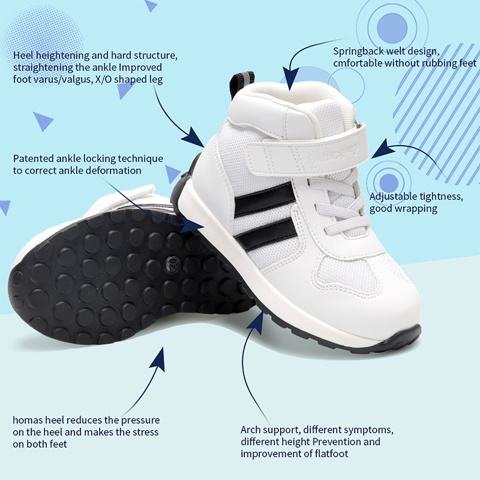 The long-term wearing orthopedic shoes can effectively correct and prevent various foot skeletal problems, like varus foot, valgus foot, flat foot, in-toeing gait, out-toe gait, O-shaped legs, X-shaped leg. It benefits a lot to the correction and improvement of thenature and nurture bone problems.
