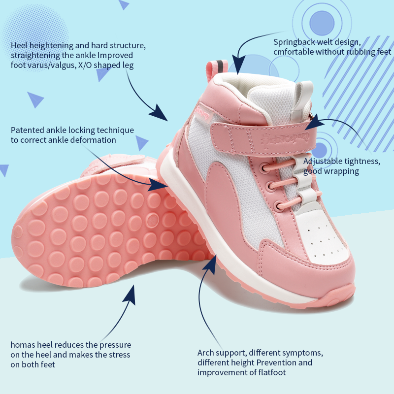 The long-term wearing orthopedic shoes can effectively correct and prevent various foot skeletal problems, like varus foot, valgus foot, flat foot, in-toeing gait, out-toe gait, O-shaped legs, X-shaped leg. It benefits a lot to the correction and improvement of thenature and nurture bone problems.
